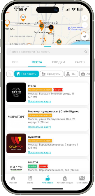 Выбирайте локацию или магазин, и мы подскажем все предложения в этом месте